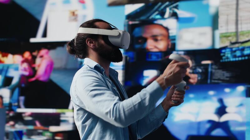 High tech person uses virtual reality headset for a 3d web design, showcasing artificial intelligence for social media connection. Influencer working on storytelling for digital world. Camera A. Pro Video