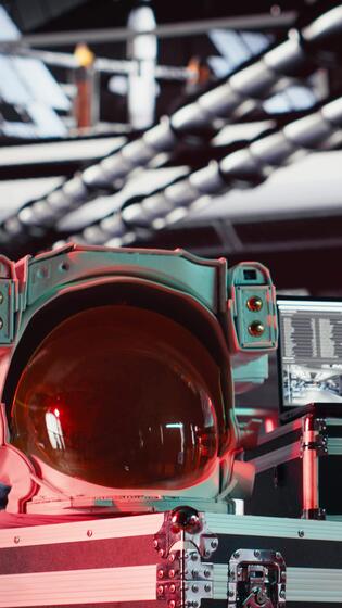 Vertical Close up of isolated screen monitor inside futuristic spacecraft bay used for running telemetry software. Chroma key display used for reviewing space station onboard analytics Pro Video