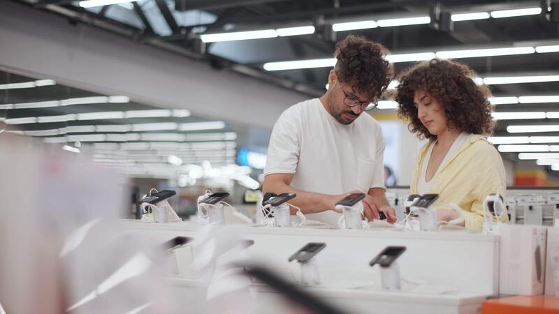 Young couple carefully selecting newest smartphone models, comparing features and technologies while browsing electronic store display in slow-motion contemplation Pro Video