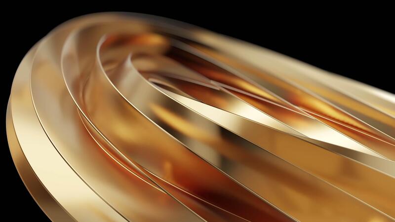Close-up abstract view of swirling golden metallic ribbons creating a dynamic, fluid shape against a dark background with reflections and highlights. Pro Video