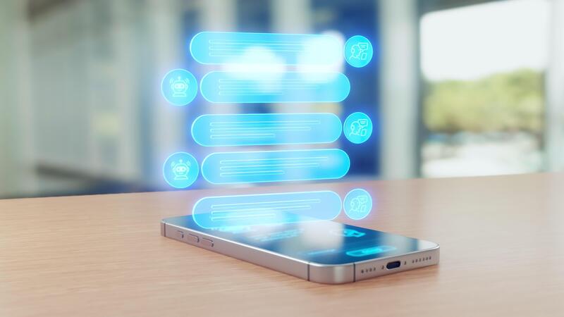 A smartphone on a table projects a futuristic holographic interface showing AI chat bubbles and icons for artificial intelligence conversation. Pro Video