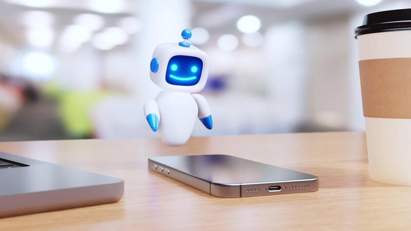 Cute AI robot character processes and manages emails surrounded by digital icons on a desk with modern devices. Concept of automated email sorting and communication. Pro Video