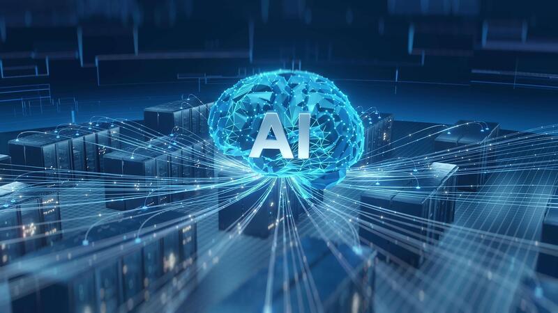 Abstract visualization of artificial intelligence connecting data servers. AI concept with brain network node linking to computer racks in a futuristic data center environment. Pro Video