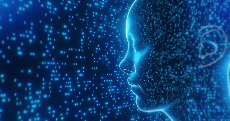 artificial intelligence background human head composed of data points and binary code. Represents concepts of digital mind, machine learning, and futuristic technology. Pro Video