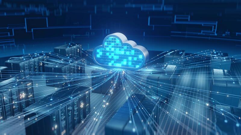 Abstract visualization of cloud computing connecting to server racks in a data center, representing data transfer, network communication, and modern digital technology. Pro Video