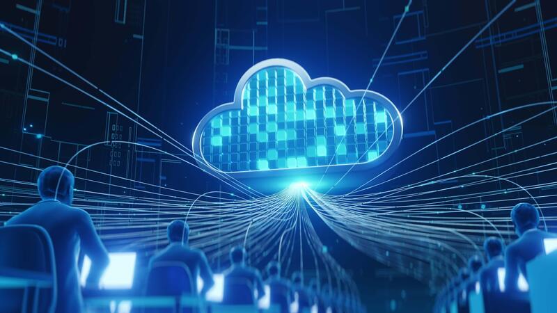 Abstract visualization of cloud technology with stylized figures accessing data streams in a digital network environment representing computing, communication, and data management. Pro Video
