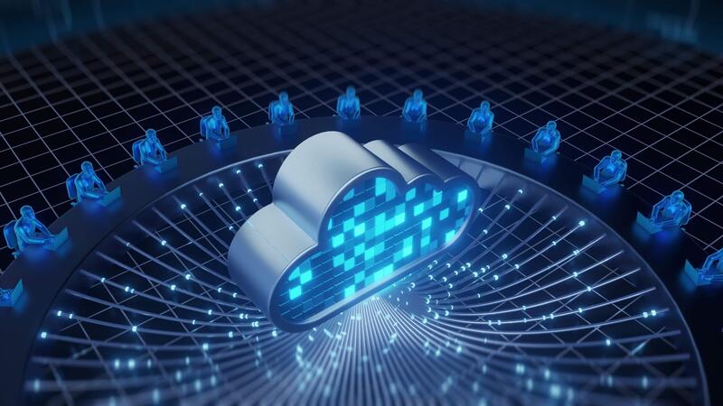 Virtual team meeting connects to a central cloud data system with streams of information flowing to digital figures working on laptops, representing global business communication and analytics. Pro Video