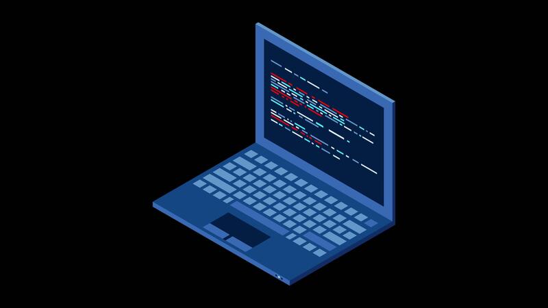 Isometric laptop animation. 3d isometric laptop computer. Abstract programming language and program code on a laptop screen. Transparent background with alpha channel, Pro Video