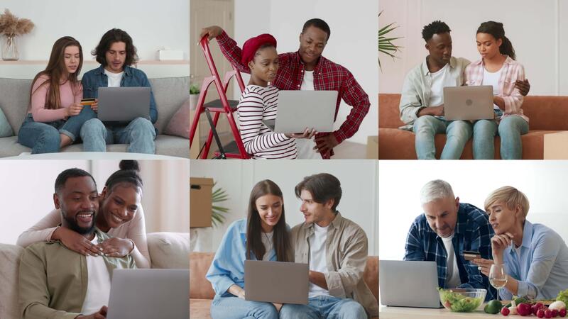 Multiple groups of diverse individuals engage with laptops, collaborating and sharing ideas in a modern, cozy environment. Each pair displays focus and interaction, showcasing teamwork. Pro Video