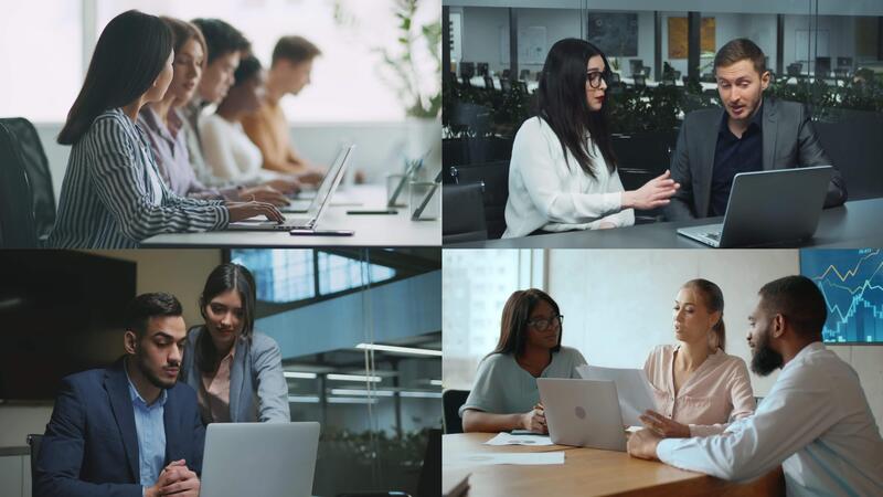 A diverse team of professionals engages with laptops and computers, collaborating on software projects in a bright, modern office environment. The atmosphere is dynamic and productive. Pro Video
