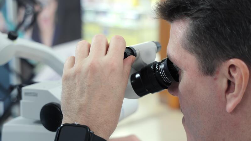 Man using microscope for close examination. Close-up of a man looking through a binocular microscope, adjusting focus during a detailed observation in a Pro Video
