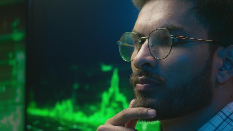 Indian Arabian man in glasses thinking contemplate ponder solving coder trader IT specialist male ethnic guy businessman business programmer analysing trading chart graph crypto currency neon indoor Pro Video