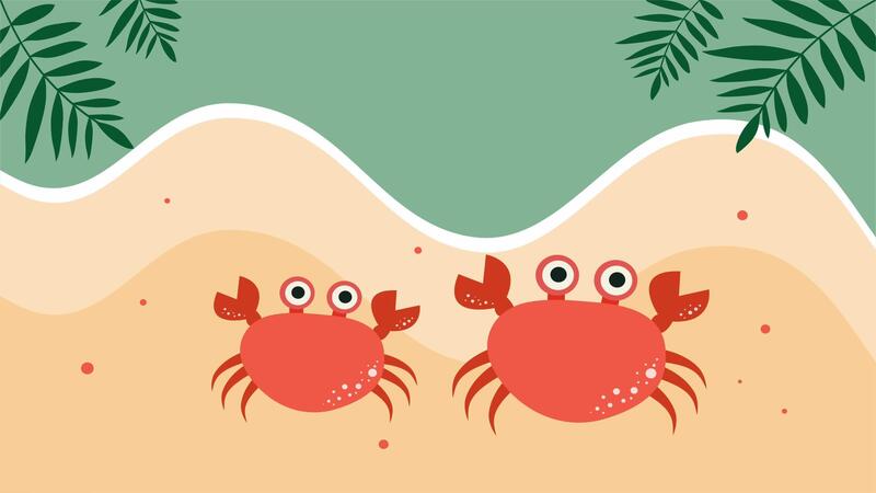 Two crabs with playful expressions stand near abstract wave edge and palm Pro Video