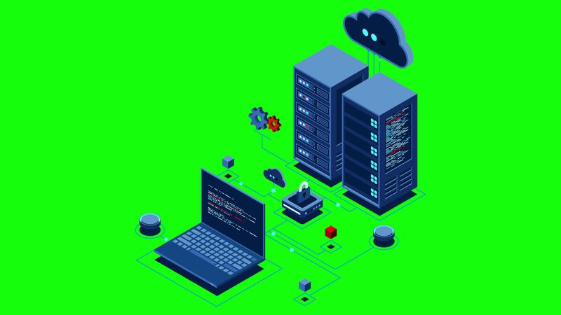 Cyber data security. Internet security isometric concept. Server room connected with laptop through protected hub. Computing internet digital technology. 4K seamless loop animation, Pro Video