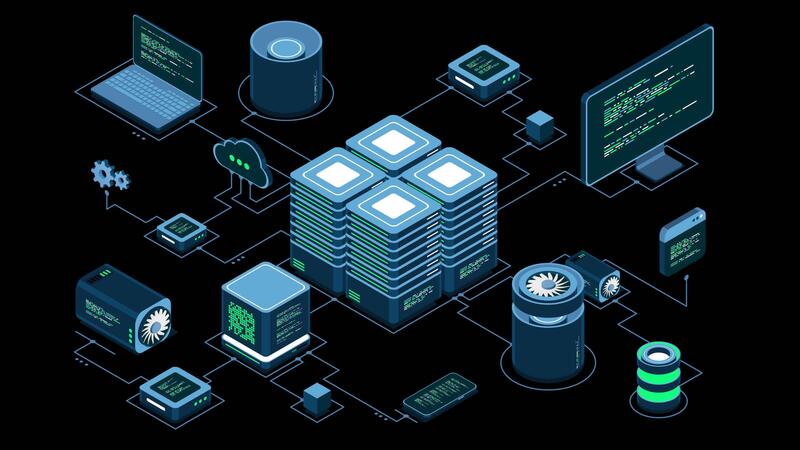 Isometric computer technology animation. Computation of big data center. Cloud computing. Online devices upload and download information. Transparent background with alpha channel, Pro Video