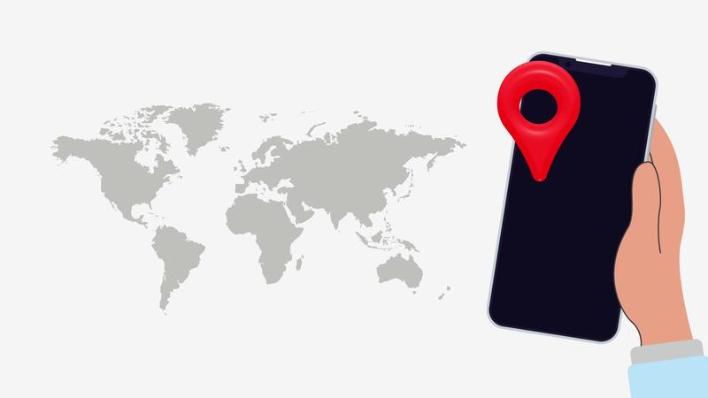 4K animation of a hand holding a smartphone with a red pinpoint icon moving up and down over a world map on a clean white background, ideal for global tech and location themes. Pro Video