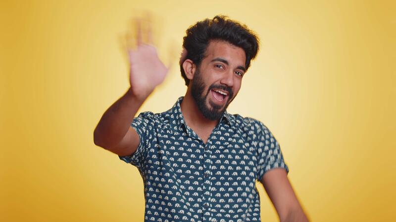 Come here, join us. Welcome. Hindu bearded man showing inviting gesture with hands, ask to join, beckoning to coming, gesturing hello, goodbye. Handsome indian guy isolated on yellow studio background Pro Video