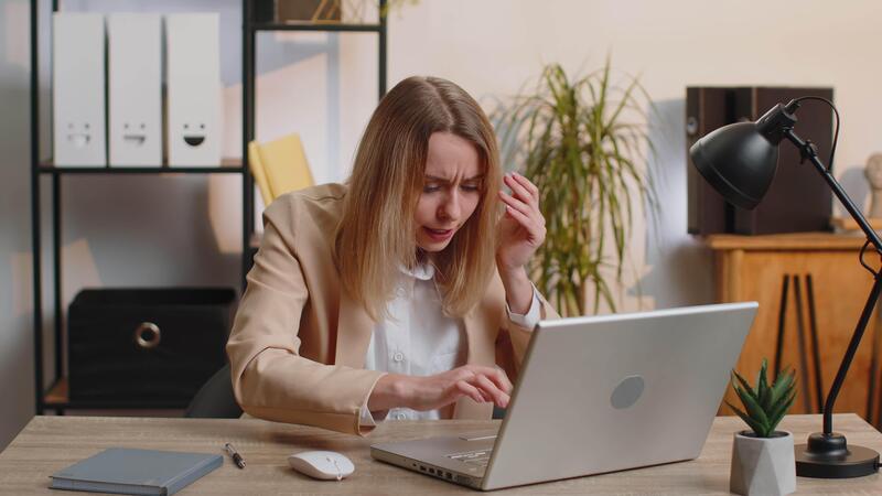 Irritated shocked young business woman while working on laptop, unexpected online website problem, computer virus data loss by hacking. Freelancer feeling mad about broken notebook at office workplace Pro Video