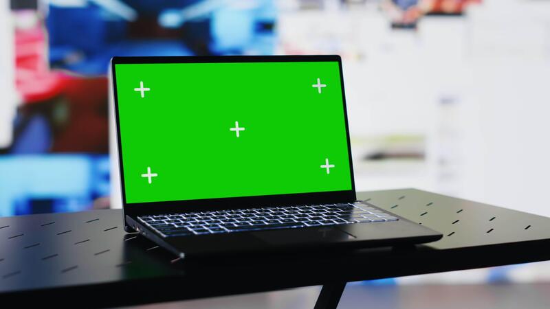 Laptop shows green screen mockup next to modern web design social network platforms, visual representation of trends and mobile interaction. Empty space for user experience. Camera A. Pro Video