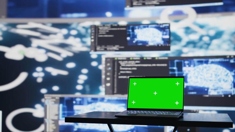 Surrounded by data and neural networks systems, laptop in empty space shows copy space screen for artificial intelligence automation and development. High tech data visualization. Camera B. Pro Video
