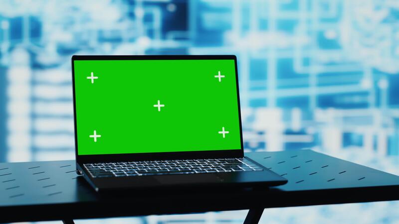 Space with a laptop that has chroma key screen next to AI neural networks system, deep learning models used to practice predictive analytics and cloud computing. Artificial intelligence. Camera A. Pro Video