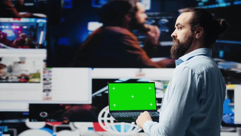 Social media manager uses pc with isolated display for online presence, web network connection for e commerce activity and social media engagement. Modern user interface design. Camera B. Pro Video