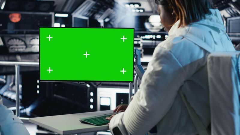 Team of cosmonauts calibrating starship sensors using isolated screen monitor, preparing for mission. Astronauts using chroma key display, beginning landing procedures on solar system planet, camera B Pro Video