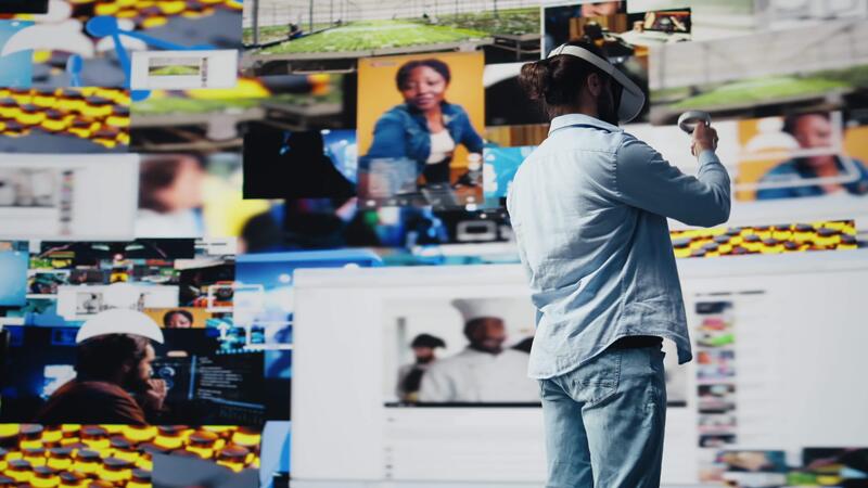 Young relaxed guy uses VR glasses for a 3d user interface design, showcasing AI connection for social media platforms. Male social network user working on entertainment in digital world. Camera B. Pro Video