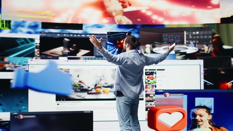 Young happy adult focused on online connection and scrolling on social pages, texting his friends and creating quality content for global reach. Trend setter guy on web design. Camera B. Pro Video
