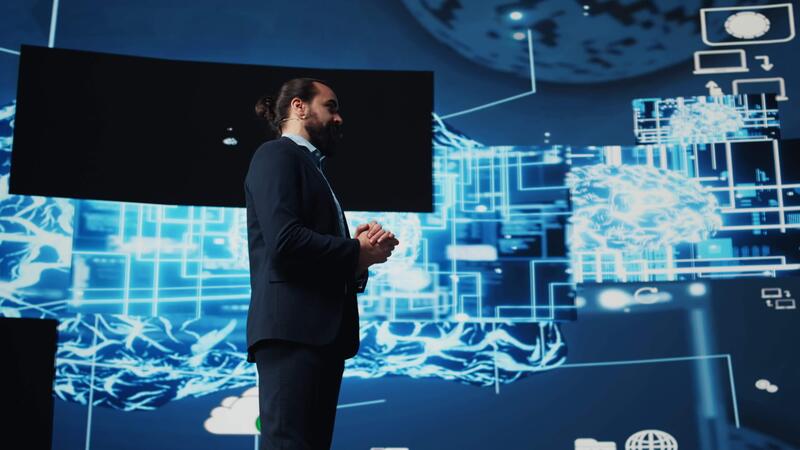 Entrepreneur presenter hosting live conference to highlight AI usage in business growth, demonstrating the use of neural networks system and machine learning. Fintech event. Camera B. Pro Video