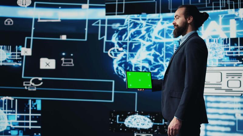 Surrounded by modern AI brain animation, entrepreneur explores virtual intelligence with green screen on device. Using automation platforms for a new innovative IT strategy. Camera B. Pro Video