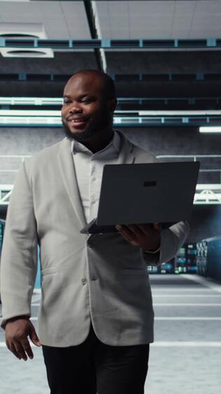 Vertical Smiling server room engineer performing maintenance on server racks using software on laptop. Happy data center IT professional upgrading blade server components using notebook, camera A Pro Video