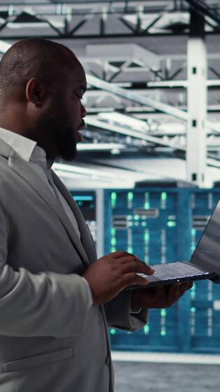 Vertical Server room infrastructure engineer scripting automated workflows using software on laptop. Data center programmer running predictive maintenance scans using notebook, camera A Pro Video