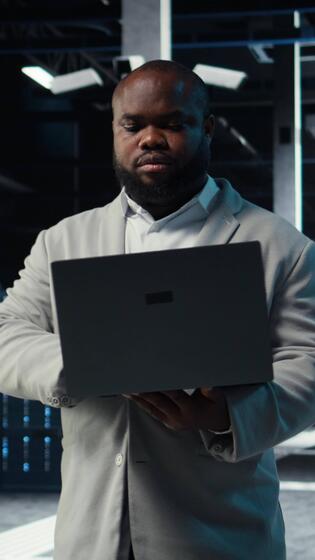 Vertical Data center admin coding, writing script on laptop, identifying bottlenecks. Server farm IT expert typing on notebook keyboard, troubleshooting bugs, implementing optimizations, camera A Pro Video