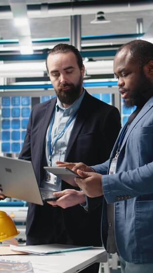 Vertical Diverse team of engineers and specialists collaborate in a solar panel factory, review blueprints and share ideas to enhance renewable energy production and sustainable innovation. Camera A. Pro Video