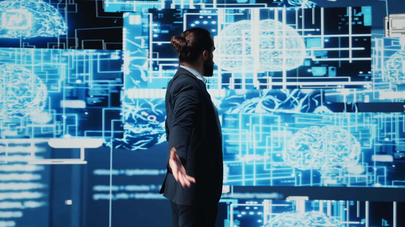 Company leader interacting with a digital AI brain symbolizing web platforms, using machine learning and algorithm development for intelligent innovation and future tech strategy. Camera B. Pro Video