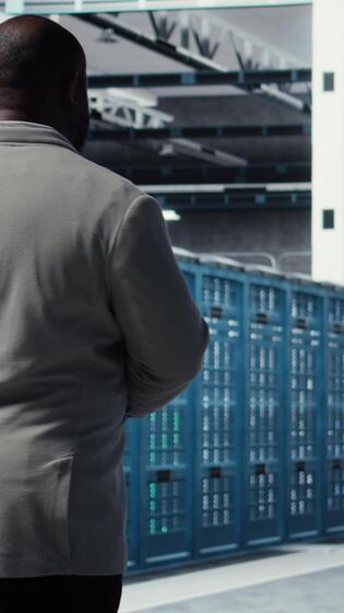 Vertical Admin walking in data center, doing inspection on infrastructure tech handling user requests. IT professional in server farm analyzing traffic patterns of equipment components, camera A Pro Video