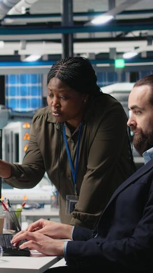 Vertical Industry experts diverse team lead brainstorming session in solar panel factory, generating new ideas for advancing renewable energy and infrastructure. High tech development. Camera A. Pro Video