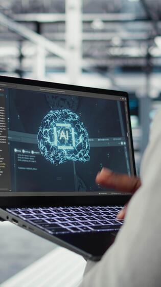 Vertical Close up of server hub admin using laptop to do infrastructure AI machine learning automatization. Data center programmer doing maintenance using artificial intelligence, camera A Pro Video
