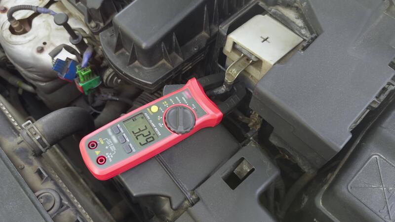 Current measurement in a car using clamp meters in the engine compartment, displaying values on a digital screen Pro Video