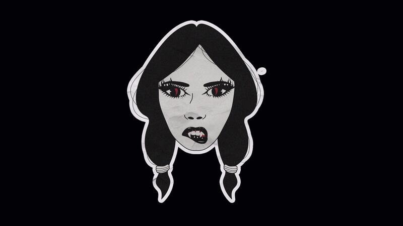 Loop animation of vampire girl sticker with sharp fangs and fiery red eyes on an unwrapped sheet of paper with transparent background Pro Video