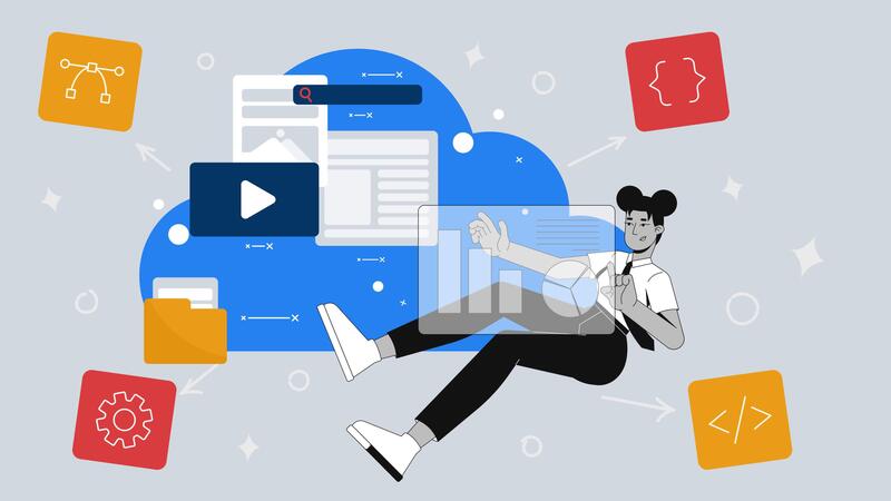 Cloud-based web development 2D animation concept. Black woman developer floating amidst programming code, data charts, mixed media animated cartoon flat metaphor creative 4K stop motion Pro Video