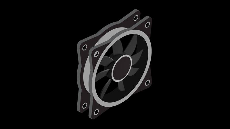 Isometric computer fan animation. Computer fan cooler. Isometric of PC case fan. Computer hardware components. Transparent background with alpha. Pro Video