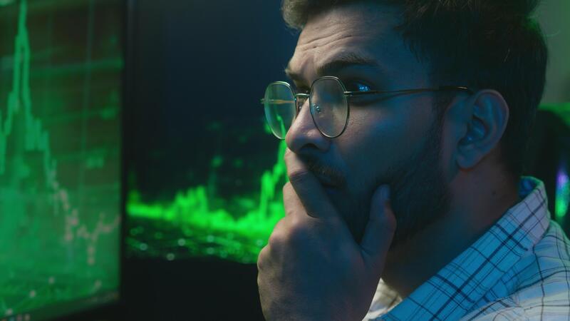 Scared worried Arabian Indian man nervous male shocked confused guy businessman business in office neon programmer coder trader broker problem trouble trading chart graph lose failure crypto currency Pro Video