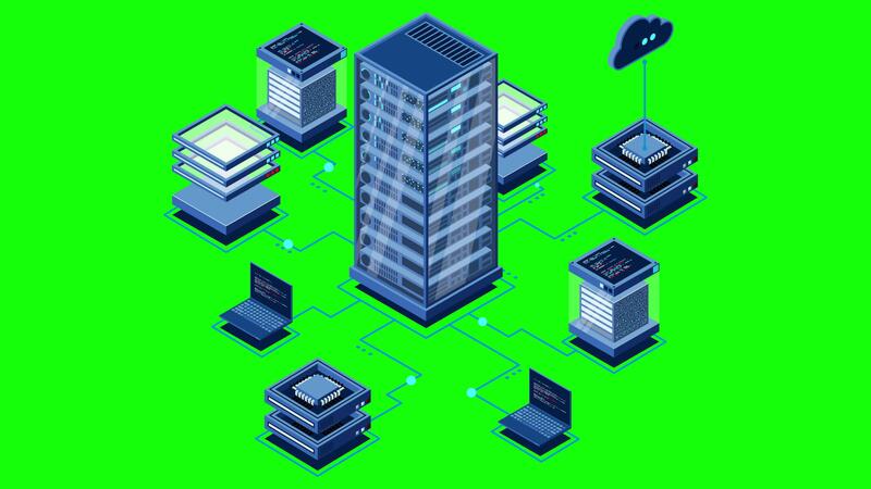 Isometric computer technology animation. Computation of big data center. Cloud computing. Online devices upload and download information. 4K . Pro Video
