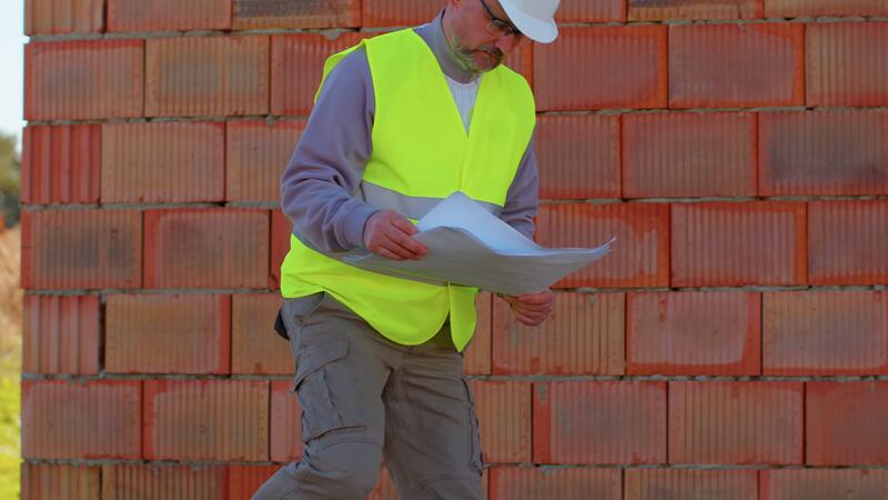 Civil engineer architect specialist analyzing blueprints to control working at construction site. House on background. Developer builder foreman in helmet inspecting building. Real estate home project Pro Video