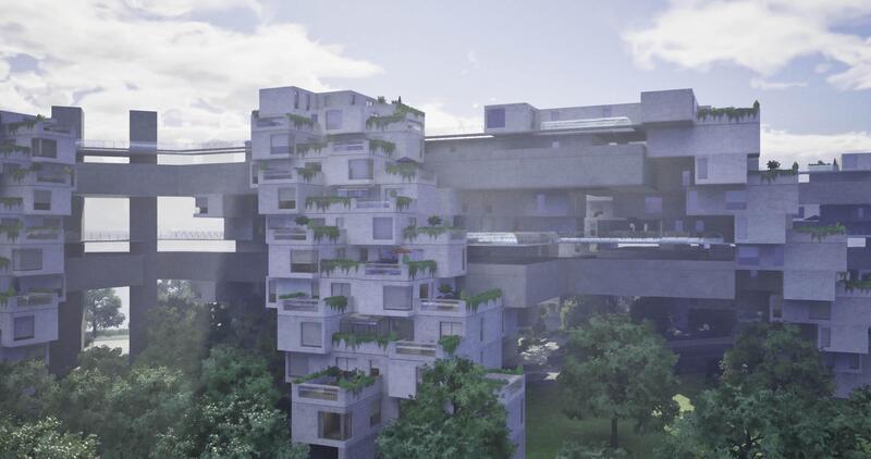 CGI Modern architectural structure with green spaces in urban setting Pro Video
