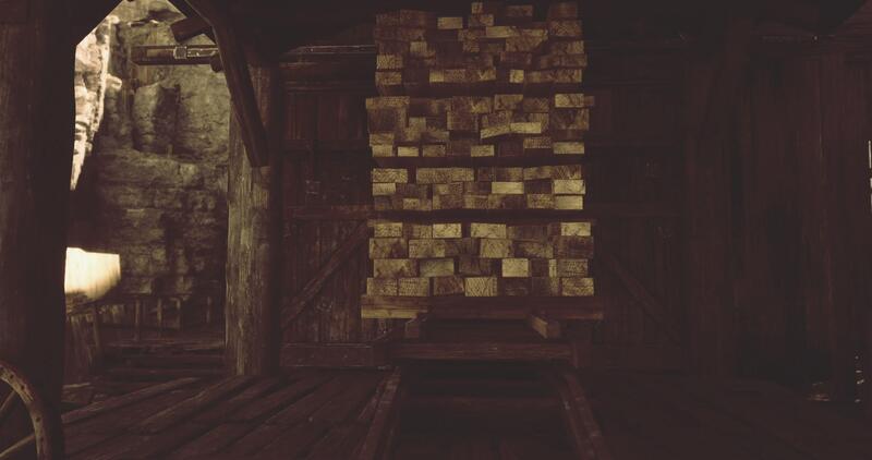 CGI Old wooden structure with stacked logs in a rustic setting near a wagon Pro Video