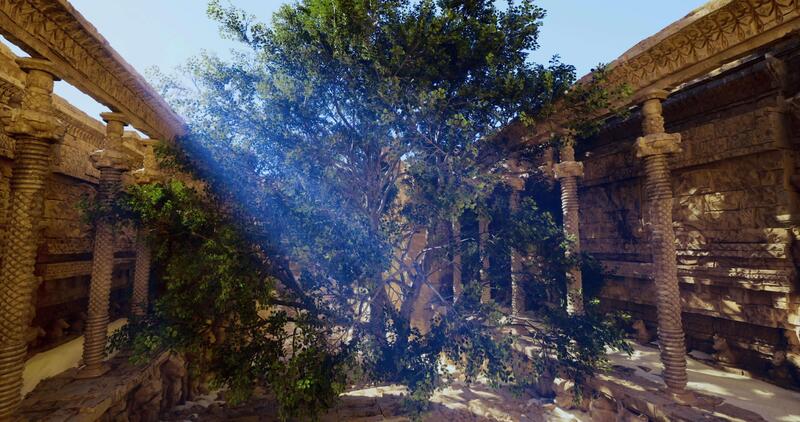 CGI Intricate ancient architecture with a large tree in a sunlit courtyard Pro Video