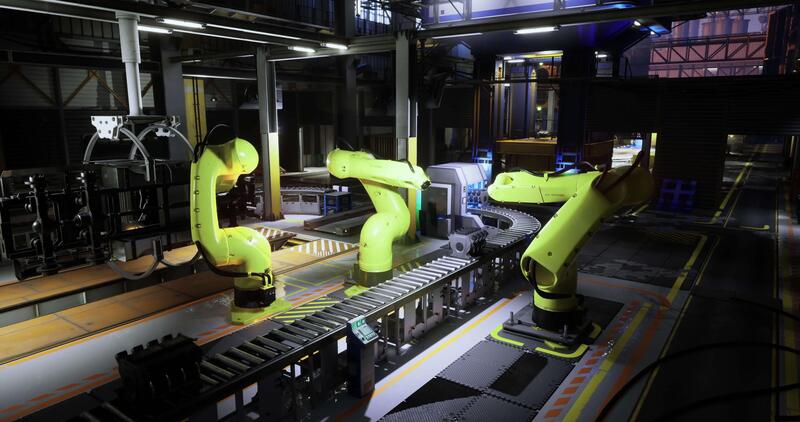 CGI High tech robotic arms work on an assembly line in a modern factory setting Pro Video